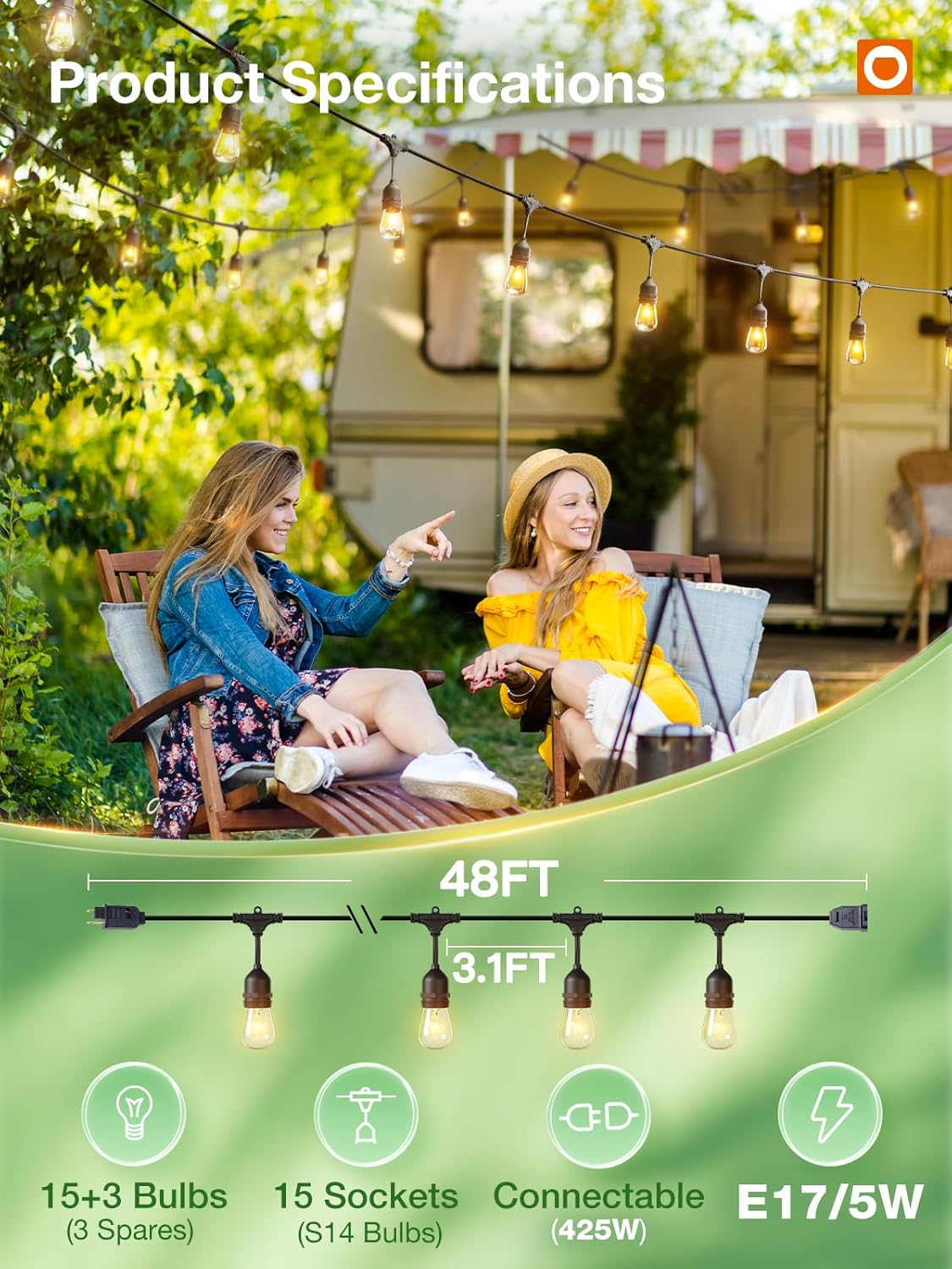 addlon 48 FT Outdoor String Lights Commercial Grade Weatherproof Strand, 18 Edison Vintage Bulbs, 15 Hanging Sockets (3 Spare Bulbs), ETL Listed Heavy-Duty Decorative Christmas Lights for Patio Garden