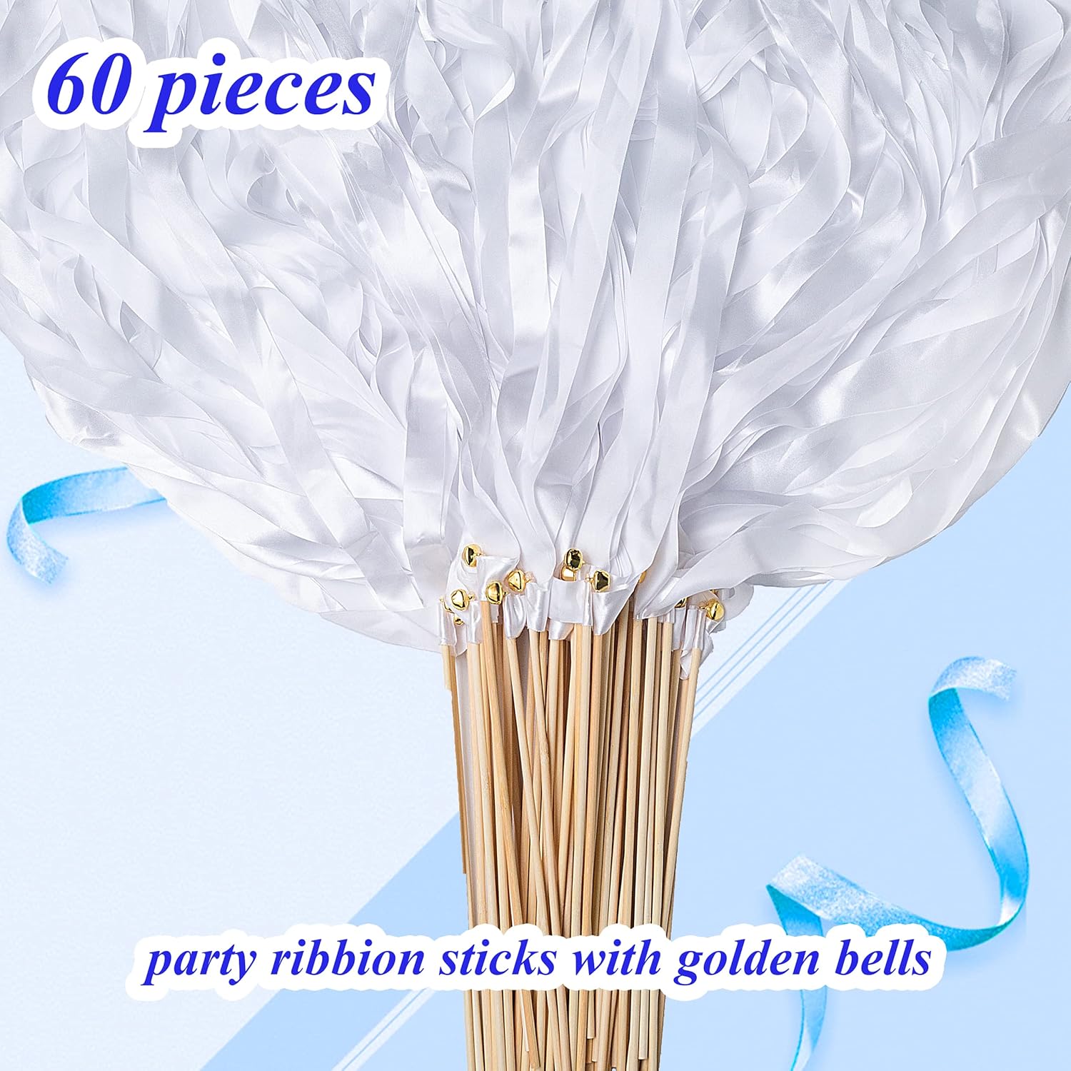 60 Pieces Wedding Colorful Ribbon with Bells, Party Ribbons Streamers Sticks Magic Wish Fairy Wand for Wedding Party Holiday Activities Favors (White-60)