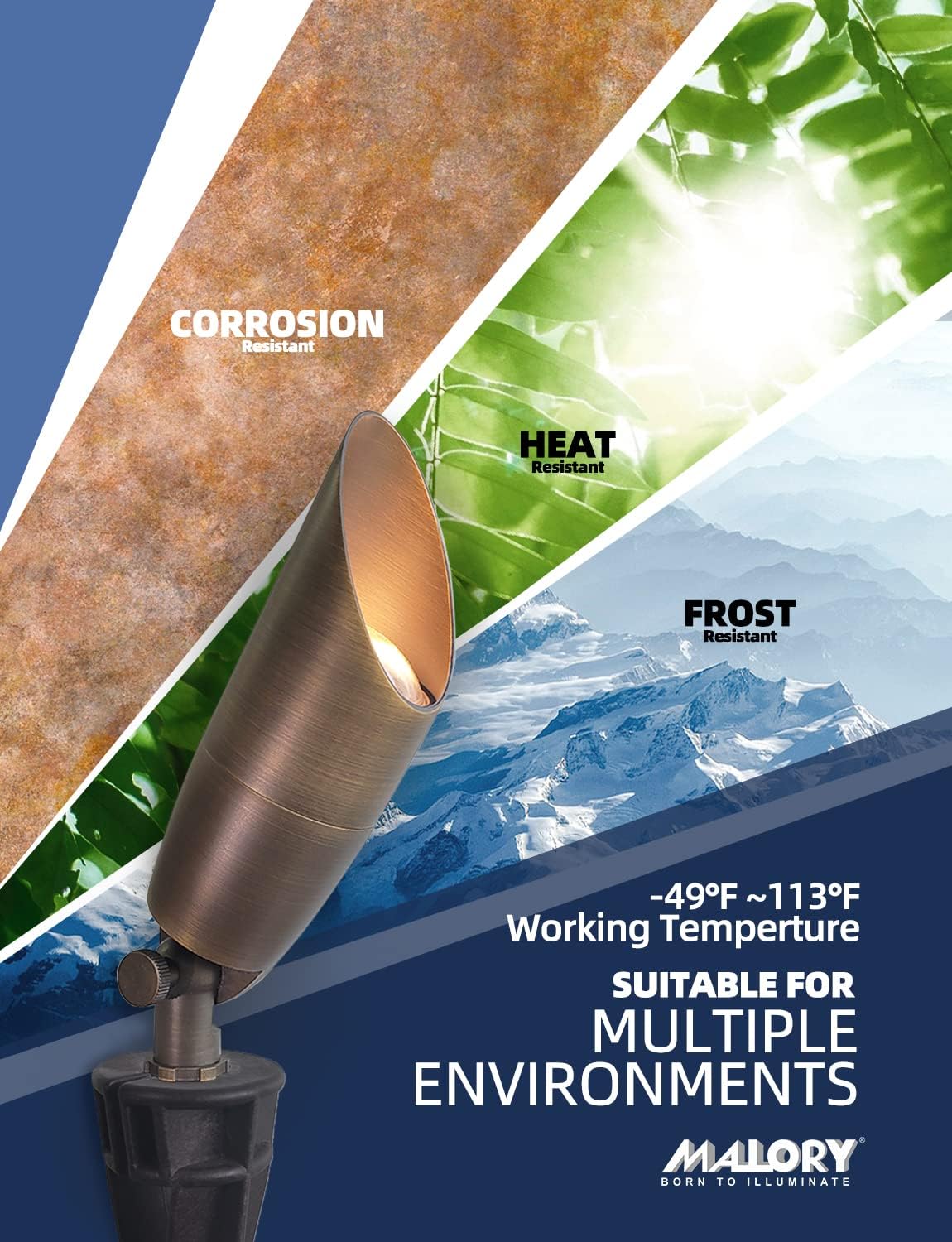 - BRASS LIGHT FIXTURE:MALORY landscape spotlight is constructed of die-cast brass for durability and beauty.Brass spot light doesn't corrode,more durable and reliable than aluminum and plastic fixtures,ideal for any uplighting application.Simple design structure for the light fixture make it looks beautiful yet unobtrusive in any landscape,suitable for decorating most houses and yards.