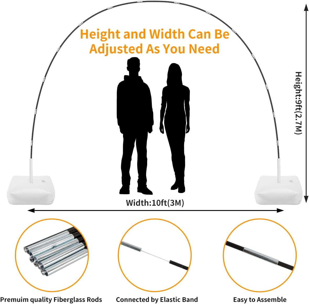 - Adjustable Size & Easy to Assemble: With inflated balloons prepared, you could set the arch within 10 minutes.You can adjust the height and width of the bow by adjusting the distance between the bases. You can also use the ground secure ropes and ground nails to fix as required