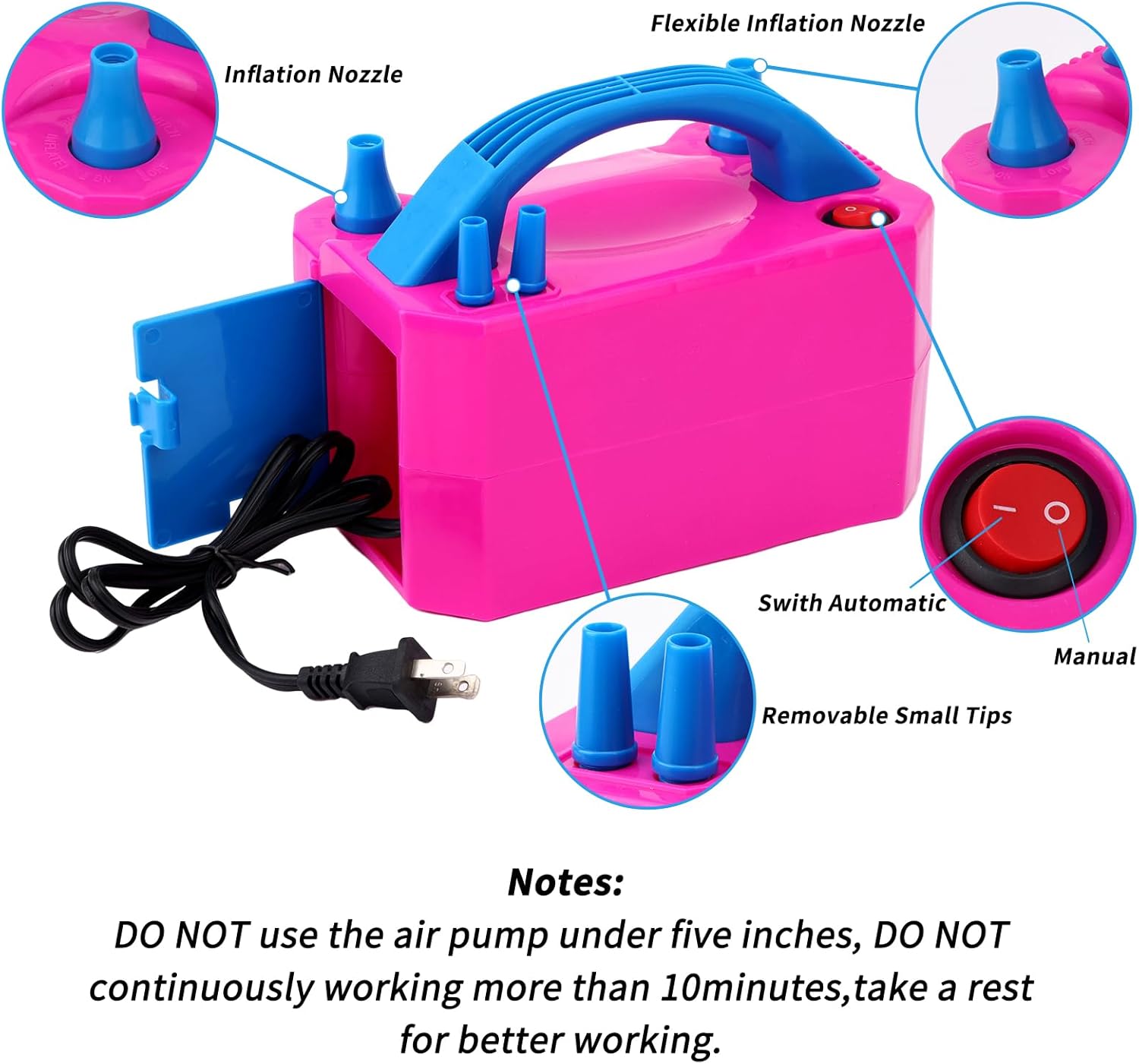 - Notes: Do not use the air pump under five inches balloons,we recommend take a rest every 10 minutes of use for better working
