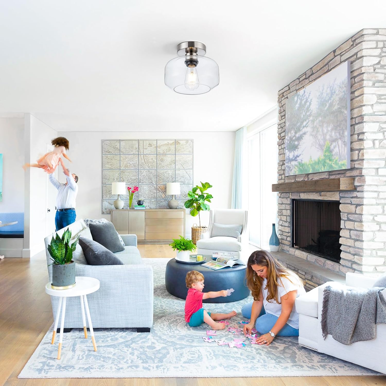 - ⨠Premium Semi Flush Mount Design 1.Retro-modern brushed nickel ceiling light with hand-blown clear glass shade offering crystal-clear transparency. Rust-resistant metal base fits farmhouse, vintage and modern decors. Perfect as hallway light fixtures or bathroom ceiling light.