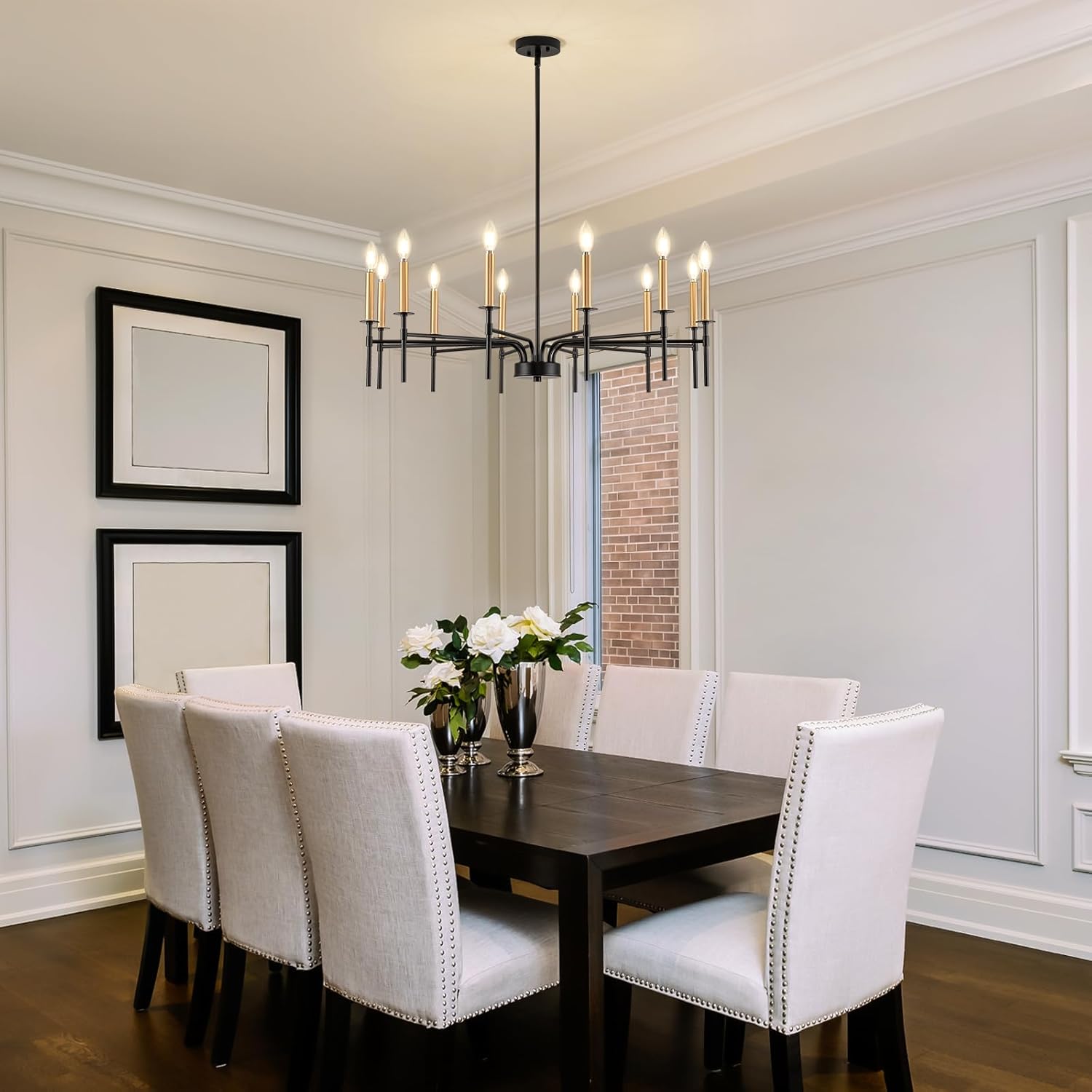 - Modern Classic Candle Chandelier Design: ONESMING black and gold chandelier light fixture is inspired by candle light decorations, easy to get an ever-changing sense of ambiance. The entire lamp body is made of sturdy metal for a solid structure, with 12 round wrap-around candelabras and an easy-to-operate stable extendable pole. The combination of black and gold finishes not only complements a variety of modern minimalist interior design styles, but also enhances the overall beauty of the chandelier, making it a visually stunning centerpiece
