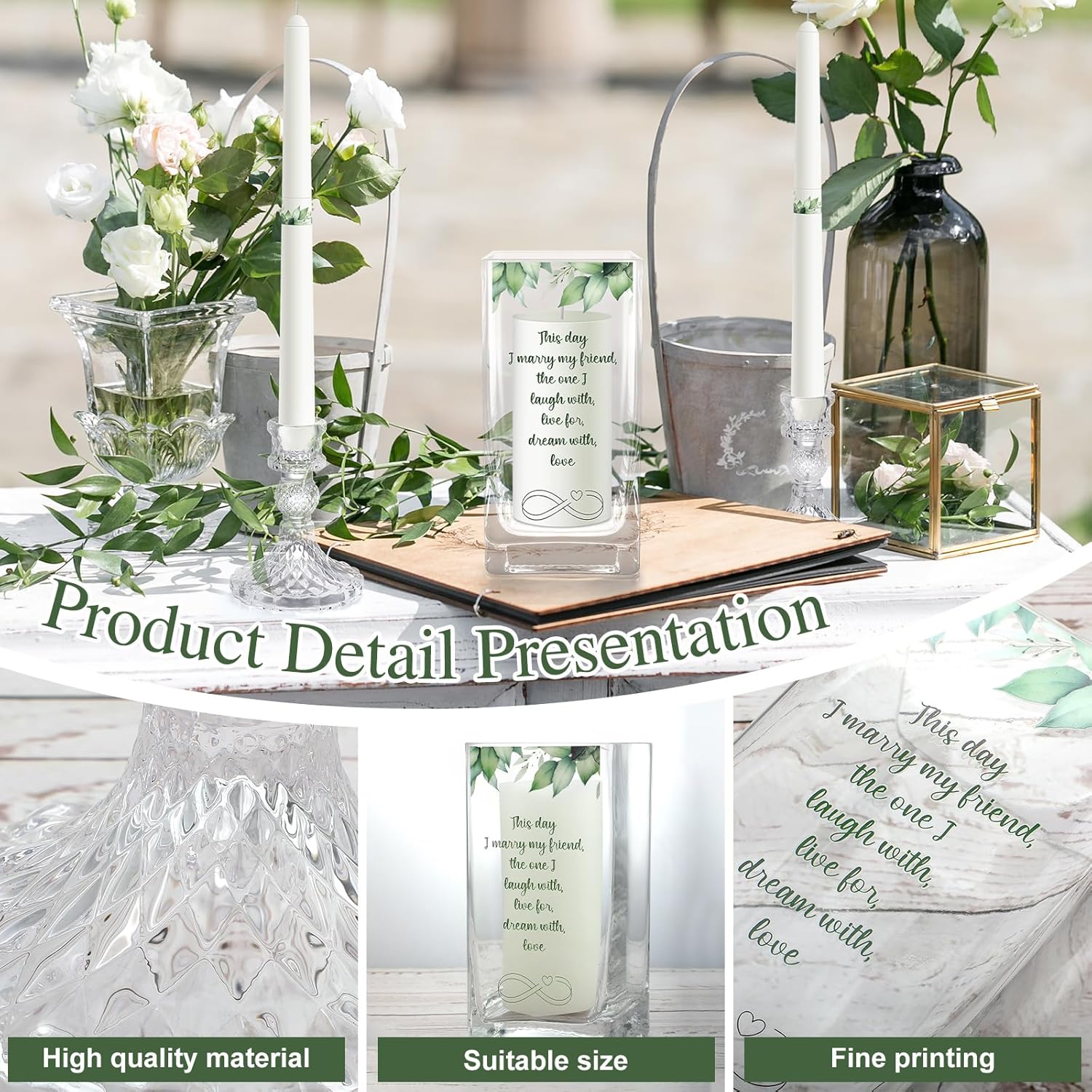 - Comprehensive Unity Wedding Candles Ceremony Set: the package includes 2 unity wedding taper candles, 1 unity wedding white pillar candles, 1 square 4 x 8 inch glass candle holder with wedding floral patterns sticker, 2 pieces 4 x 3.15 inches glass candlesticks holders, delicate and romantic; The unity wedding candles ceremony set will bringing romantic atmosphere for your weddings or other anniversaries