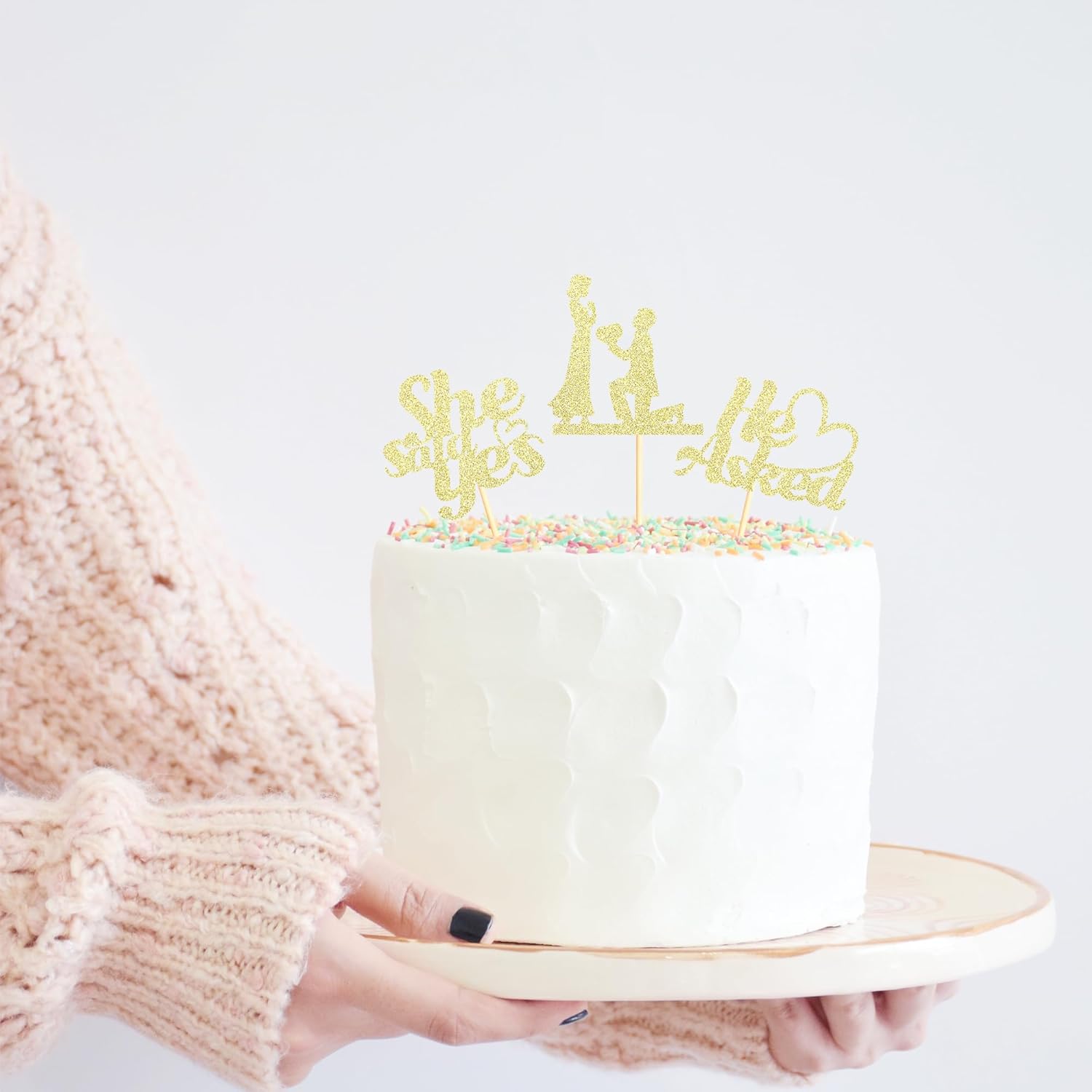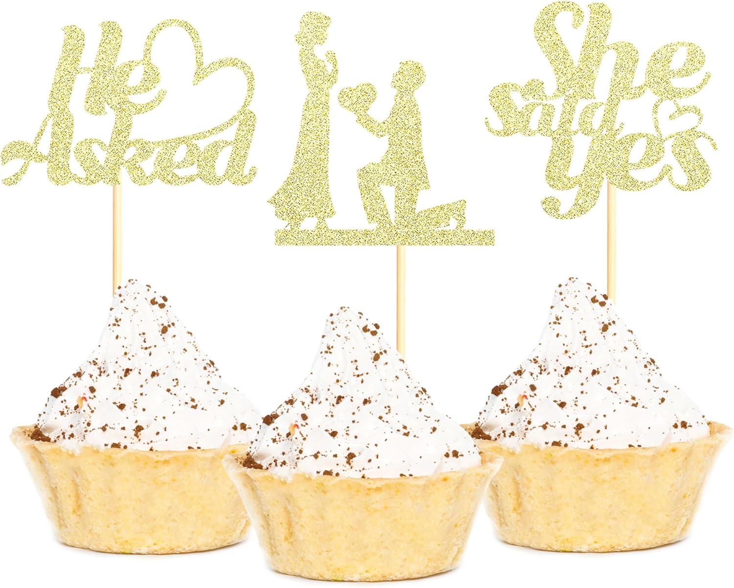 - Package Included: 3PCS Gold Glitter He Asked She Said Yes Cupcake Toppers add "propose" sign. Already assembled so you can insert into wedding engagement party decoration, which make your cake icing on the cake. Size: W 2.3 inch * H 4.72 inch / W 6 cm * H 12 cm(Including Stick)