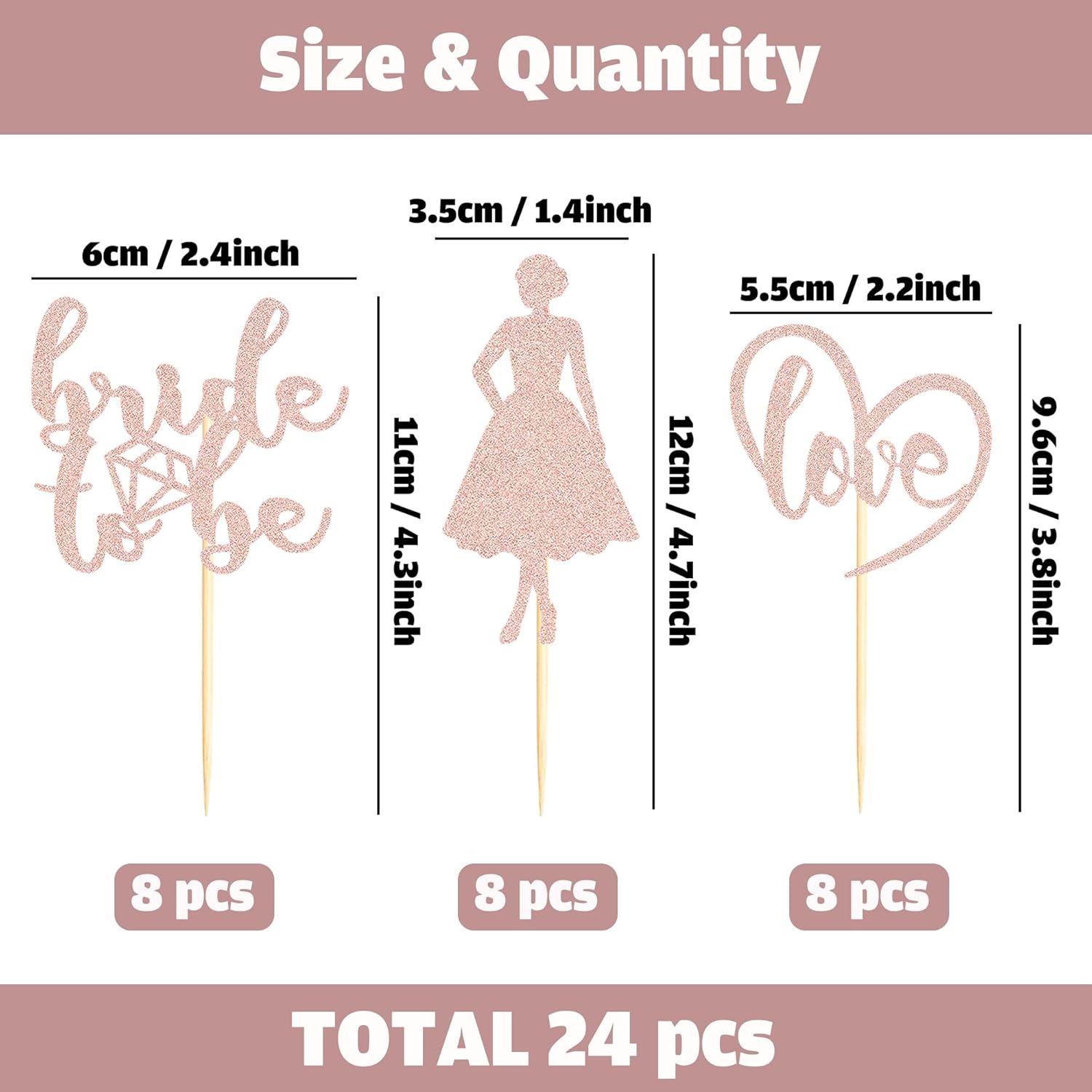 - Unique Design: This 24PCS Bride to Be Cupcake Toppers with Heart Dress to make your Wedding Engagement party stand out! The delicate design like your a match made in heaven makes your dessert look more romantic. Shimmering glitterscreate a lovely and sweet feel for your wedding party