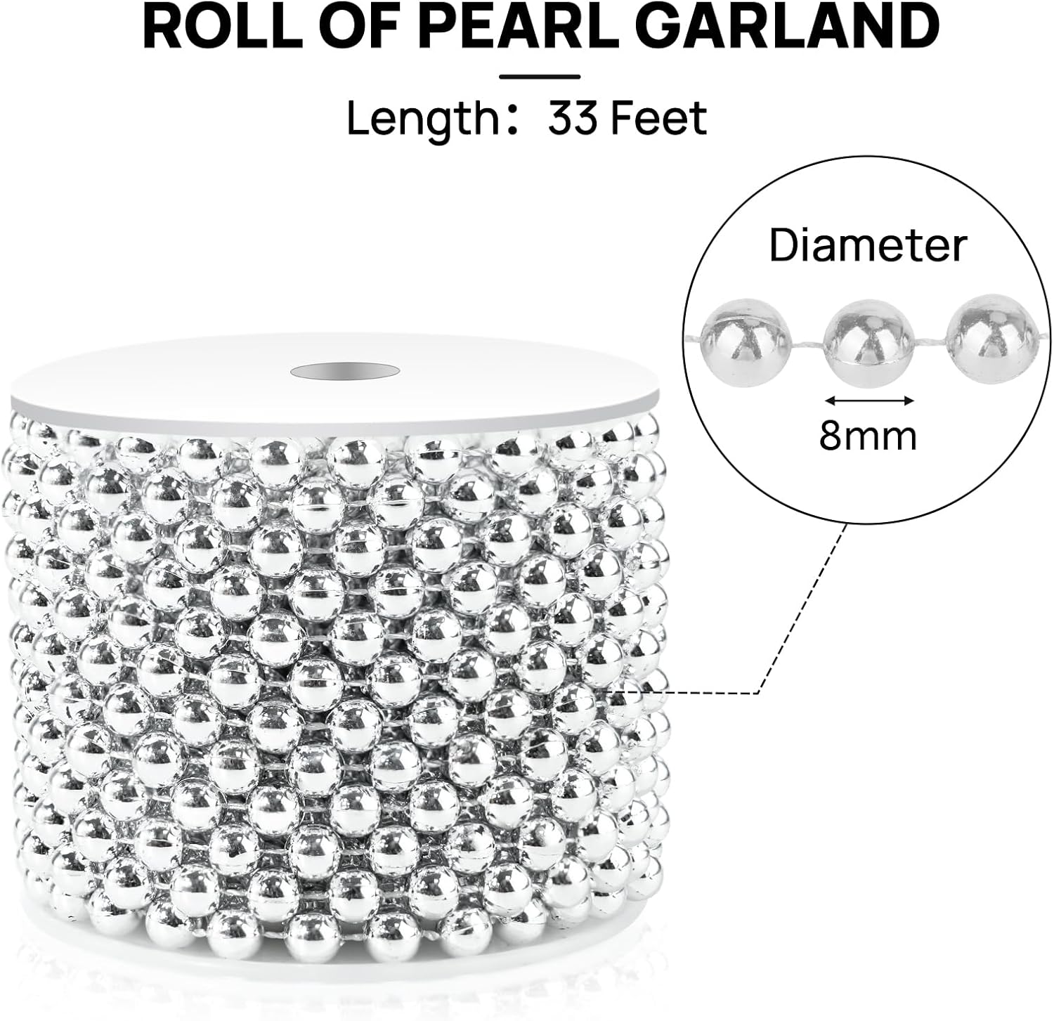 - Silver Pearl Garland - Our string of pearls is 33 feet/11 yards long per roll. Diameter of silver bead: 8mm. We have pearl garlands of different colors and sizes, you can choose according to your needs!