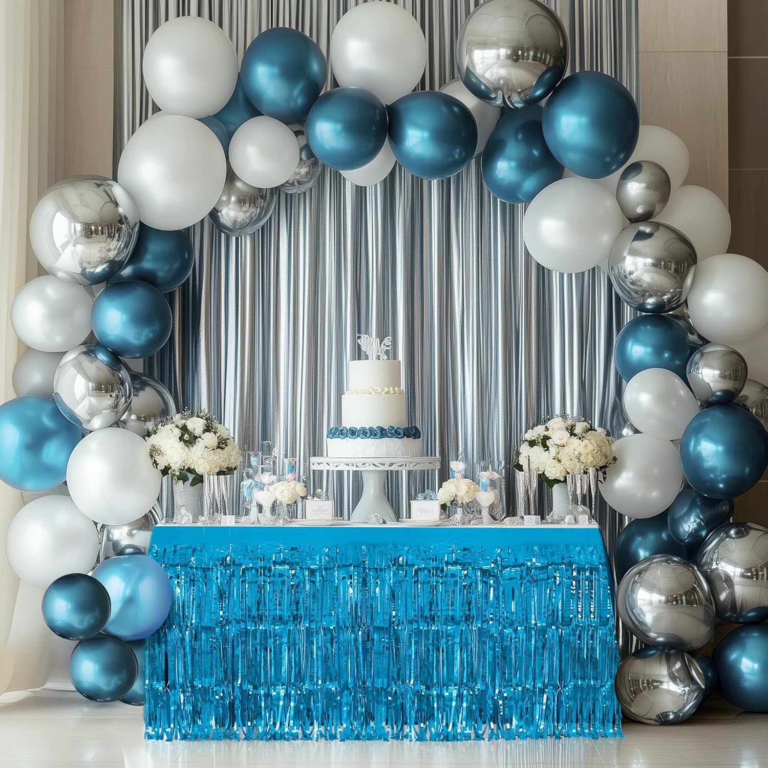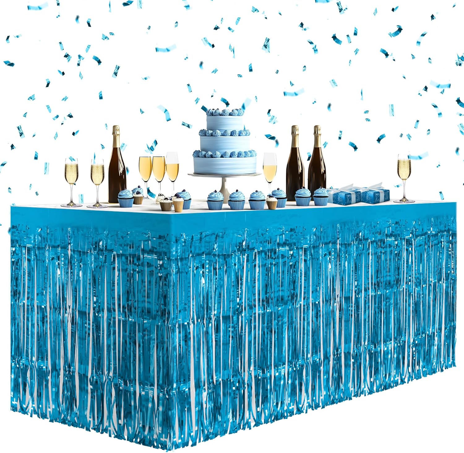 1 Pack Lake Blue Table Skirts, 29x108" Metallic Foil Tinsel Fringe Table Skirts for Rectangle Tables Streamer Curtains Backdrop, Party Decorations for Birthdays Weddings Holidays