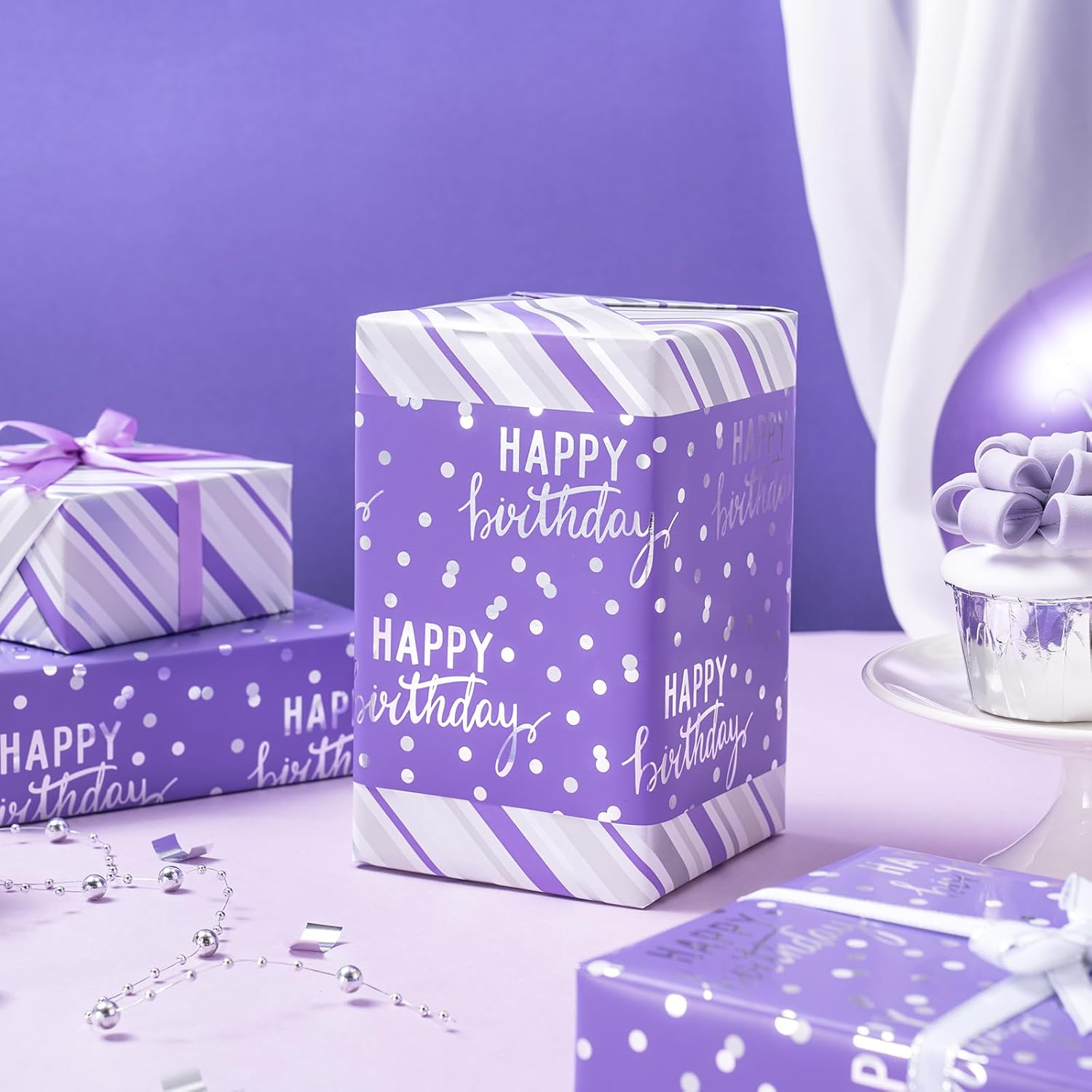 - HAPPY BIRTHDAY WRAPPING PAPER–This purple birthday wrapping paper features an elegant dual-sided design. One side showcases "Happy Birthday" in shiny silver foil with scattered metallic dots in purple, silver, and white. The reverse side presents a stylish striped pattern in coordinating shades of purple, silver, and white for a modern, sophisticated look.