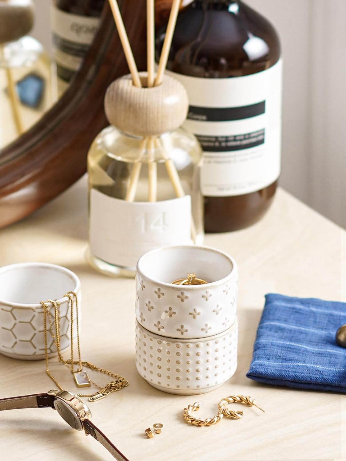 - Embossed Design: With classic white ceramic decorated in expressive embossment, these small candholders shaped to fit every corner of the room are an elegant and eye-catching choice for bedrooms, living rooms, and dining tables. Exquisite farmhouse style candle holders bring soothing and beauty to your daily life. Whether or not you put candles inside, they are your unique decorative piece