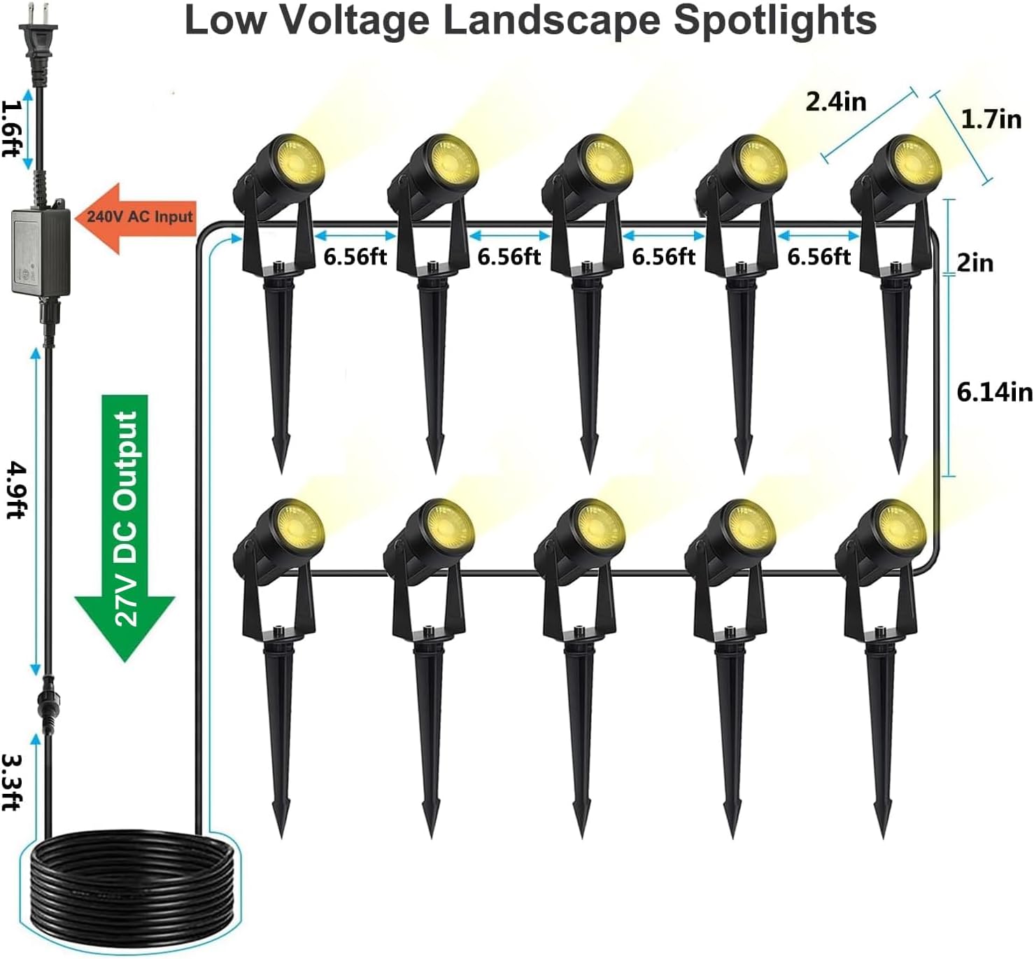 - 【Easy to Install, Plug and Play】Wired landscape lighting kits are includes 10 spot lights, 1 waterproof transformer and cables for fast and easy set up to brighten your yard. Just stick into the ground or use the included screws to mount on the wall and plug it into outlets, simple to install, hassle-free to use
