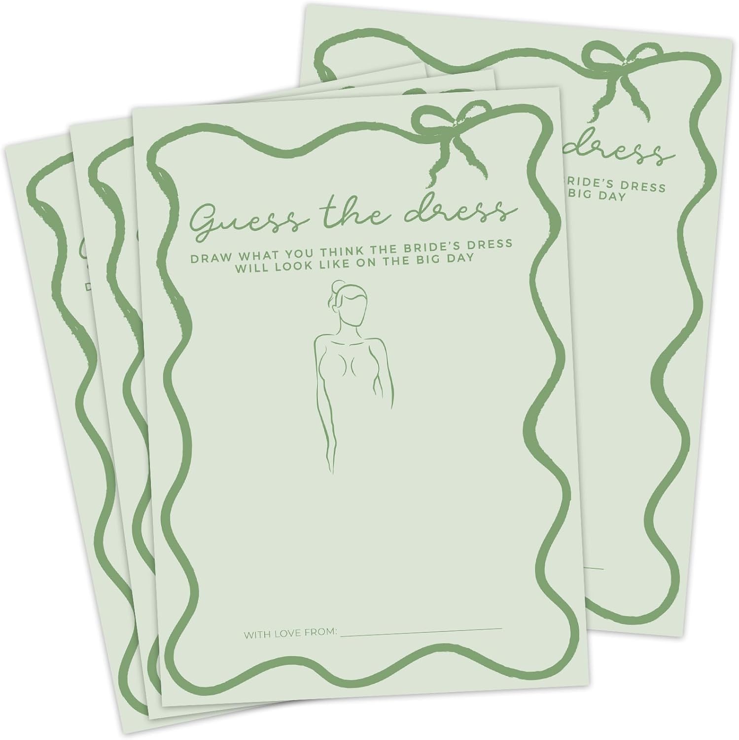 DEEKA 30 PCS Bridal Shower Games Card for 30 Guests Sage Green Wavy Border Ribbon Bow Funny Wedding Bachelorette Party Games for Reception (Guess The Dress)