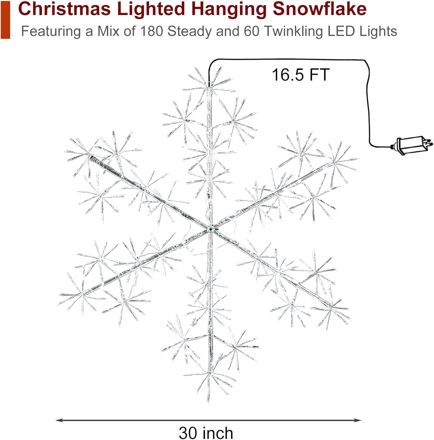 - Dimension: Upgrade your holiday decor with BAYN Hanging Snowflake Lighted Branches! 30 inches diameter is perfect for adding a mystical look to your space over the Christmas season. 16.5 ft extension wire allows for easy connection to socket