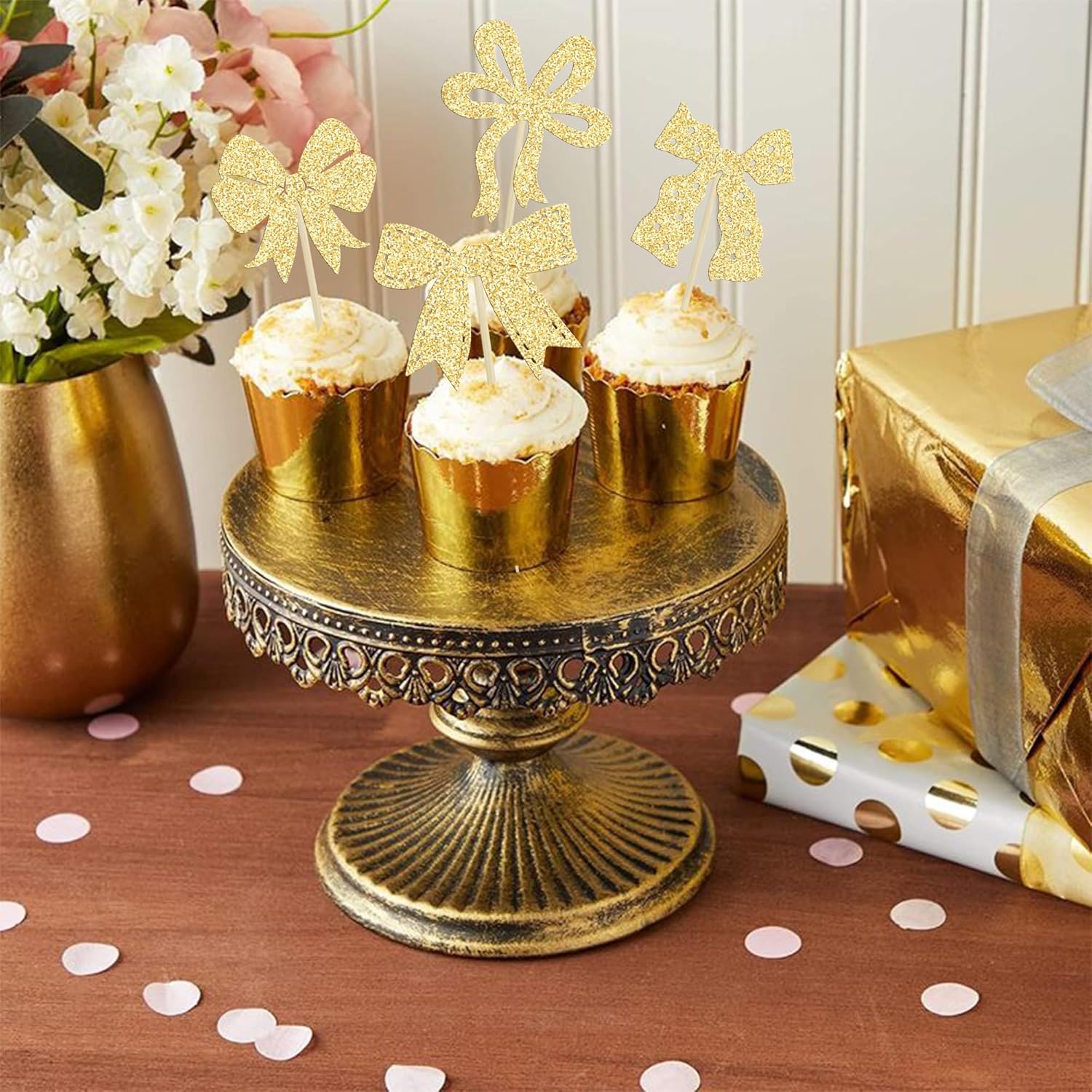 Ephlyn 24Pcs Bow Cupcake Toppers Bow Birthday Cake Topper Girls Birthday Party Decorations Bowknot Cupcake Decorations for Bridal Baby Shower Birthday Wedding Themed Party Gold