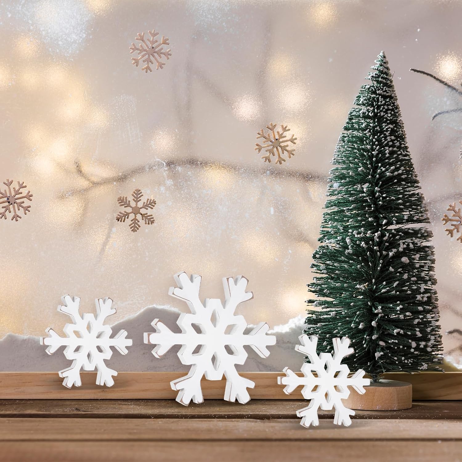 - Value Pack: You will receive 6 white wooden snowflakes, including 2 large wooden snowflakes 4 small snowflakes. Large ones are 15cm wide, small ones 10cm, all 1.2cm thick. This versatile size combo fits Christmas tabletop decor, tiered tray, or shelf, meeting your winter and Christmas decorations needs perfectly as standing Christmas decorations.